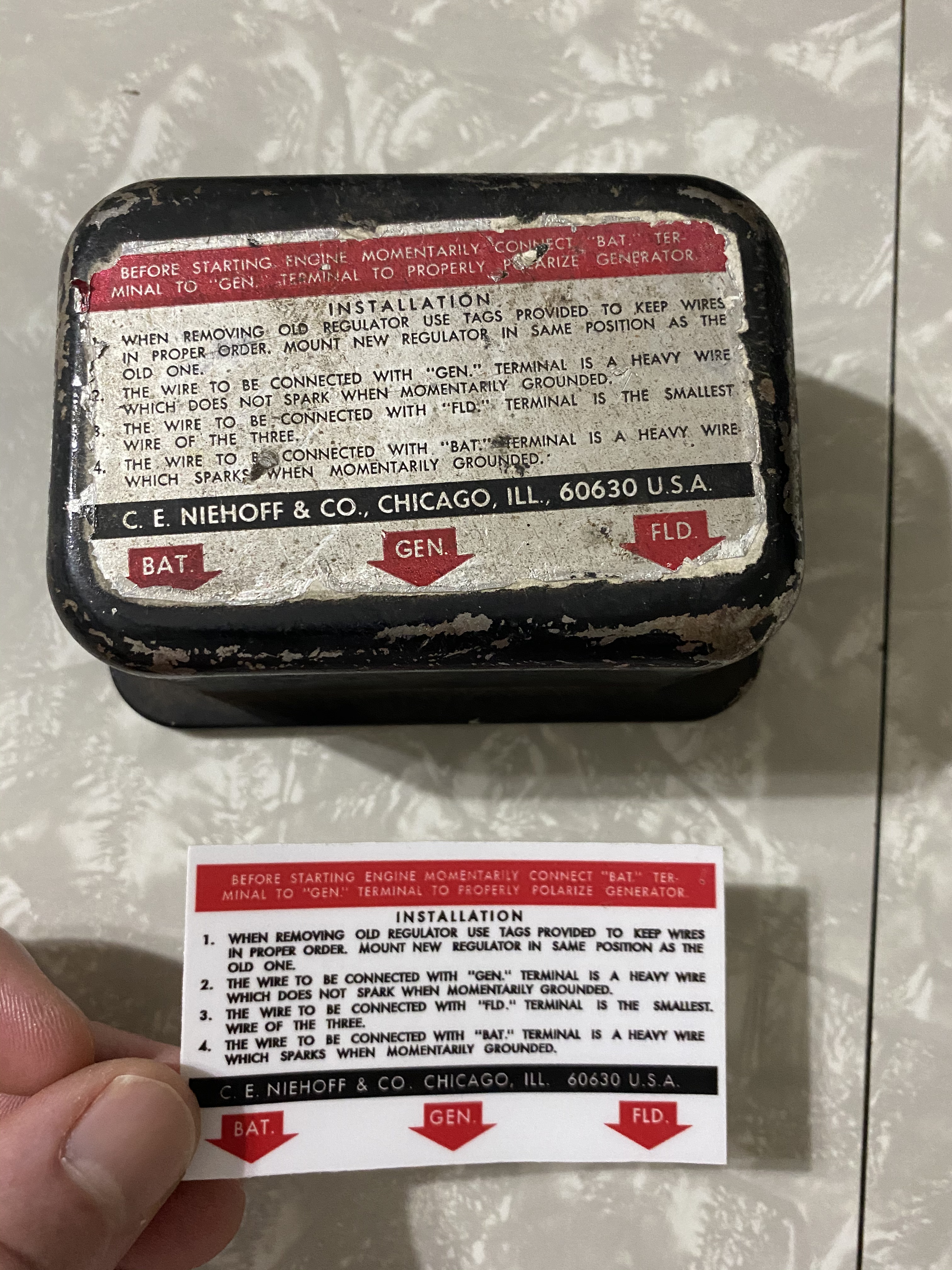 Parts/Products 12v voltage regulator information stickers reproduction. Works on 12v voltage regualtors and firewall information sticker. $7.50 shipping included anywhere in the USA. Click to share on Facebook (Opens in new window) Facebook Click to share on LinkedIn (Opens in new window) LinkedIn Click to email a link to a friend (Opens in new window) Email Like Loading...